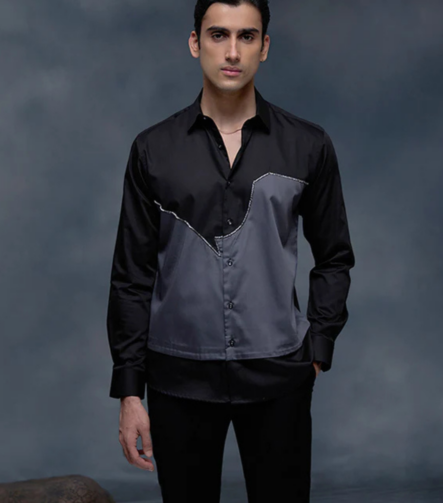 Black and Grey with Hand Embroidery Premium Cotton Slim Fit Shirt